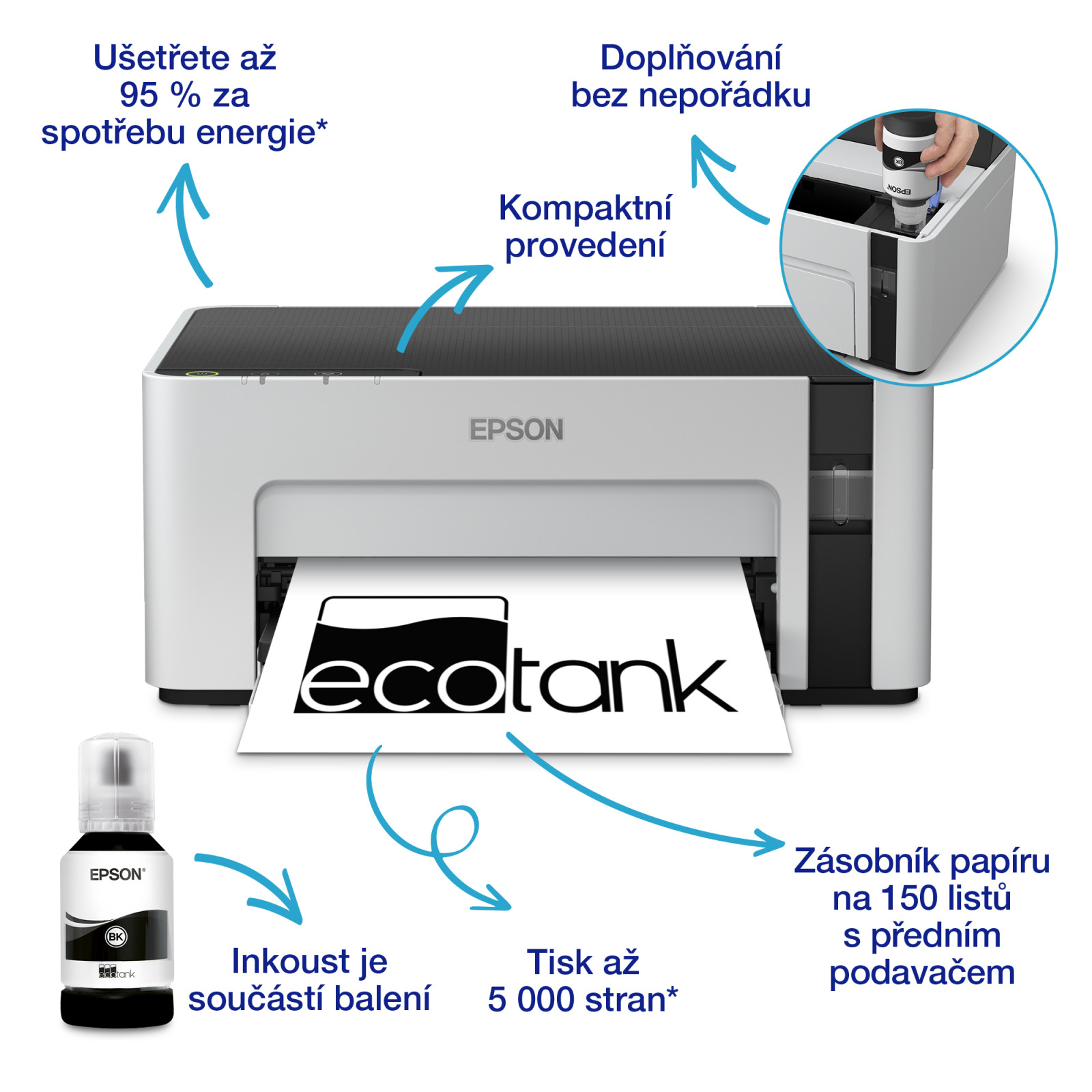 Díky systému EcoTank odpadá nutnost používat tonerové kazety. Náhradní lahvičky inkoustu umožňují snížit náklady na tisk až o 90 %*. Technologie bez zahřívání zajišťuje okamžitý start a nízkou spotřebu energie, až o 95 % nižší než u běžných laserových tiskáren.