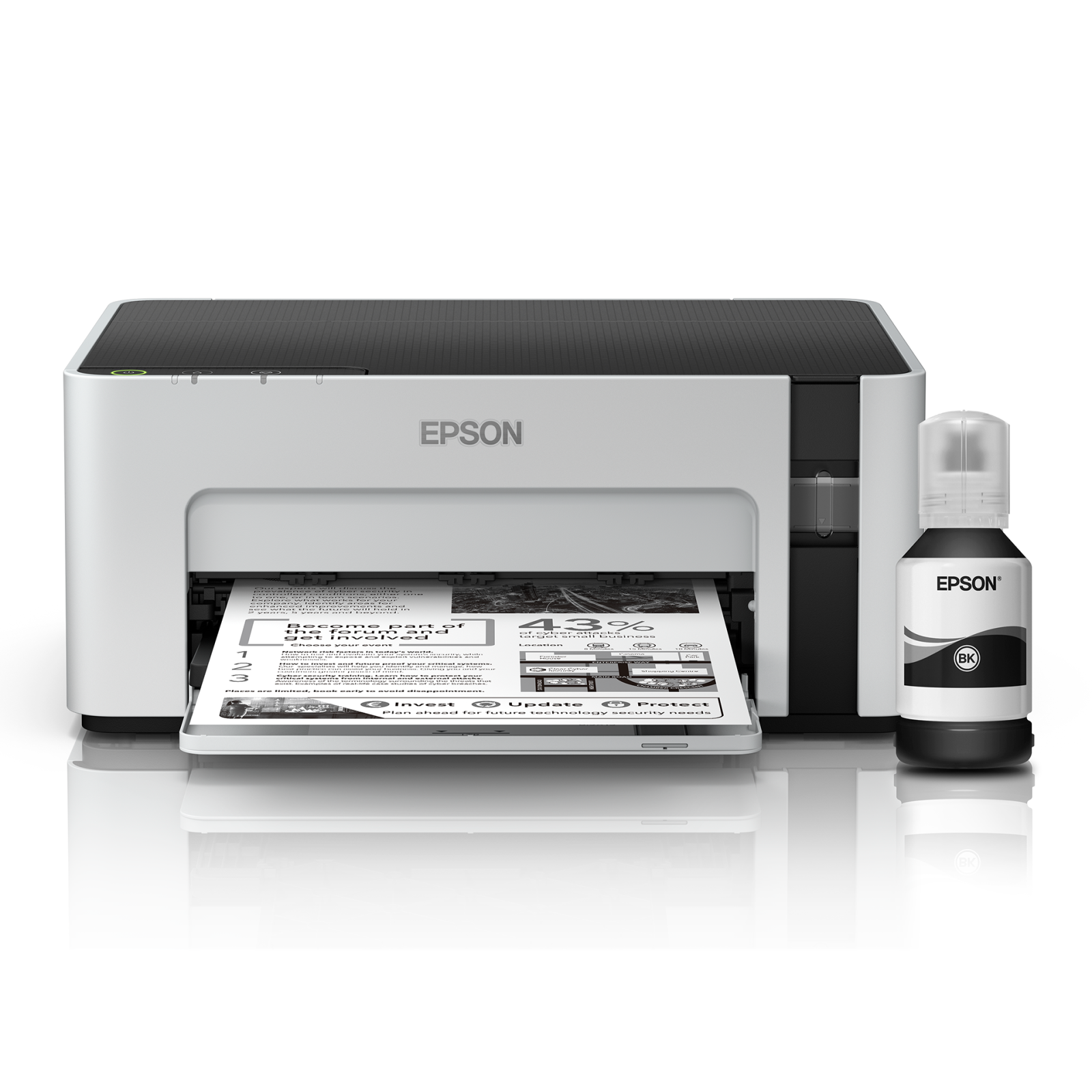Epson EcoTank M1100 je úsporná inkoustová tiskárna určená pro domácnosti a malé kanceláře. Díky velké doplnitelné nádržce na inkoust poskytuje mimořádně nízké náklady na stránku a spolehlivý provoz. S dodaným černým inkoustem vytisknete až 5 000 stran*, což výrazně snižuje celkové náklady.