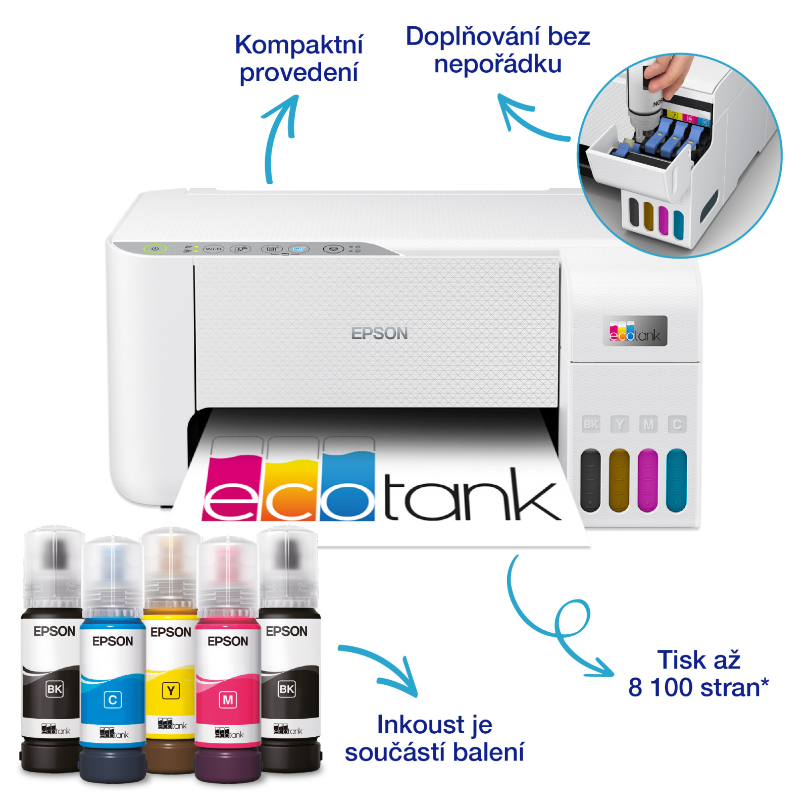 Epson EcoTank L3276 je multifunkční inkoustová tiskárna formátu A4, která je ideální volbou pro domácnosti a malé kanceláře. Díky velkokapacitním inkoustovým nádržkám nabízí mimořádně nízké náklady na tisk a dlouhou výdrž – až 8 100 stran černobíle a 6 500 stran barevně. To znamená méně časté doplňování inkoustu a výrazné úspory oproti klasickým cartridgím.